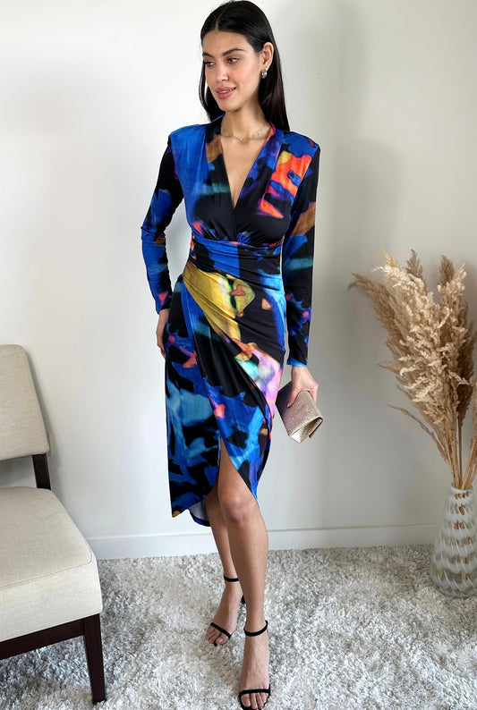 BLUE MULTI ABSTRACT PRINT SLINKY WRAP MIDI DRESS