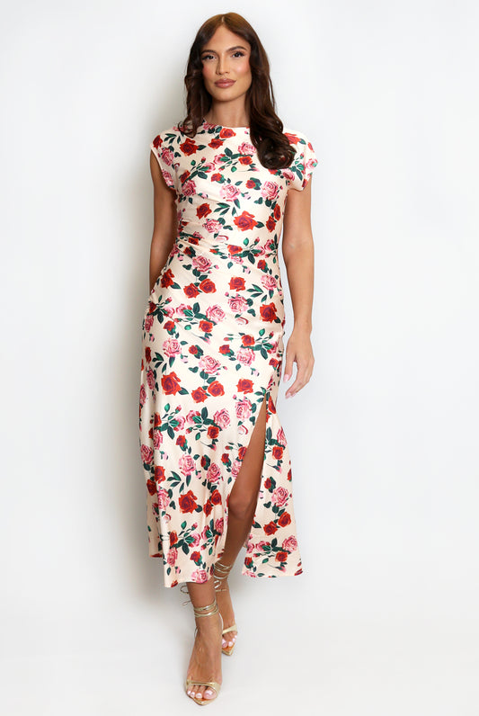 CHAMPAGNE CREAM ROSE PRINT MIDI DRESS