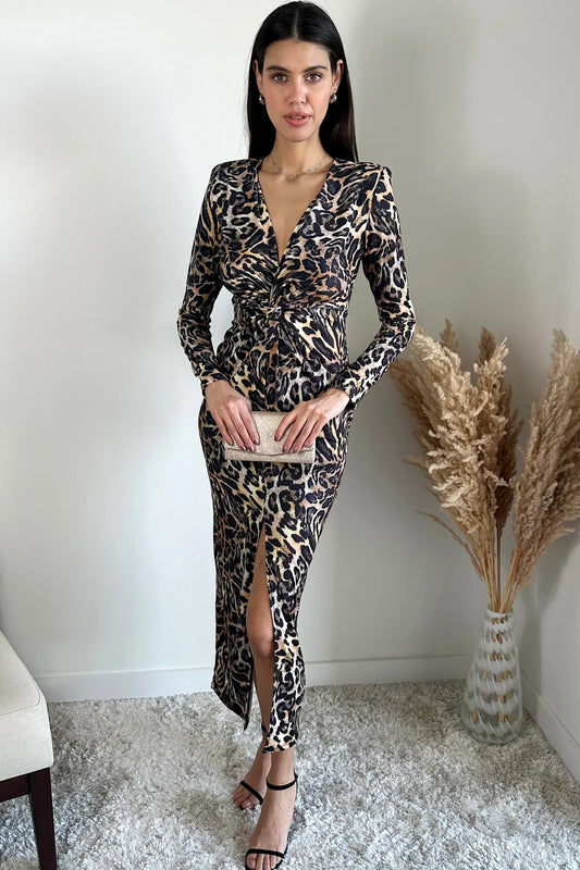 LEOPARD PRINT SLINKY KNOT DETAIL MIDI DRESS