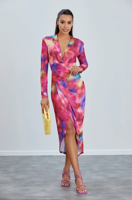 PINK MULTI ABSTRACT PRINT SLINKY WRAP MIDI DRESS