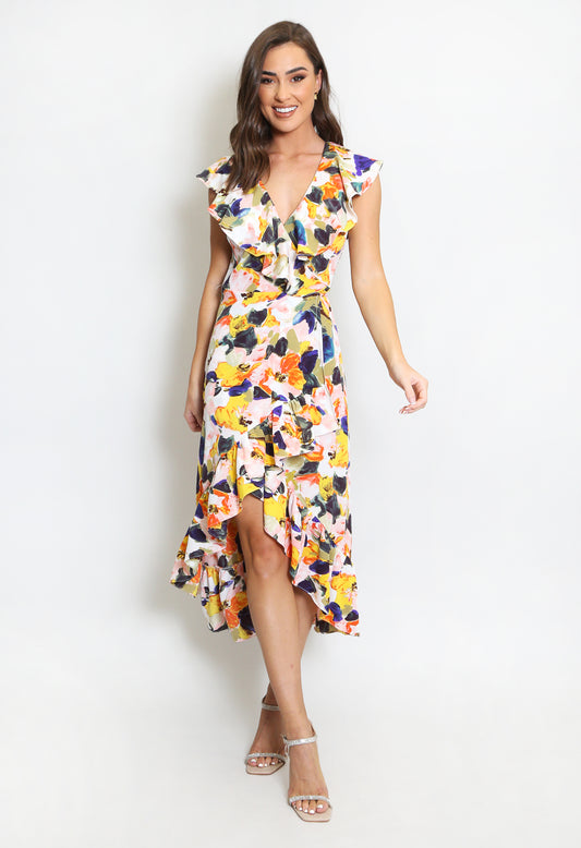 WATERCOLOUR MULTI FLORAL FRILL WRAP MIDI DRESS